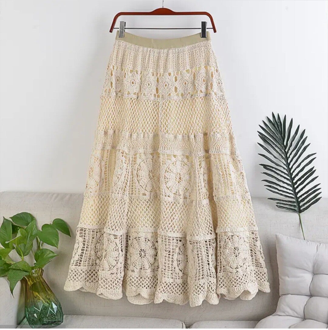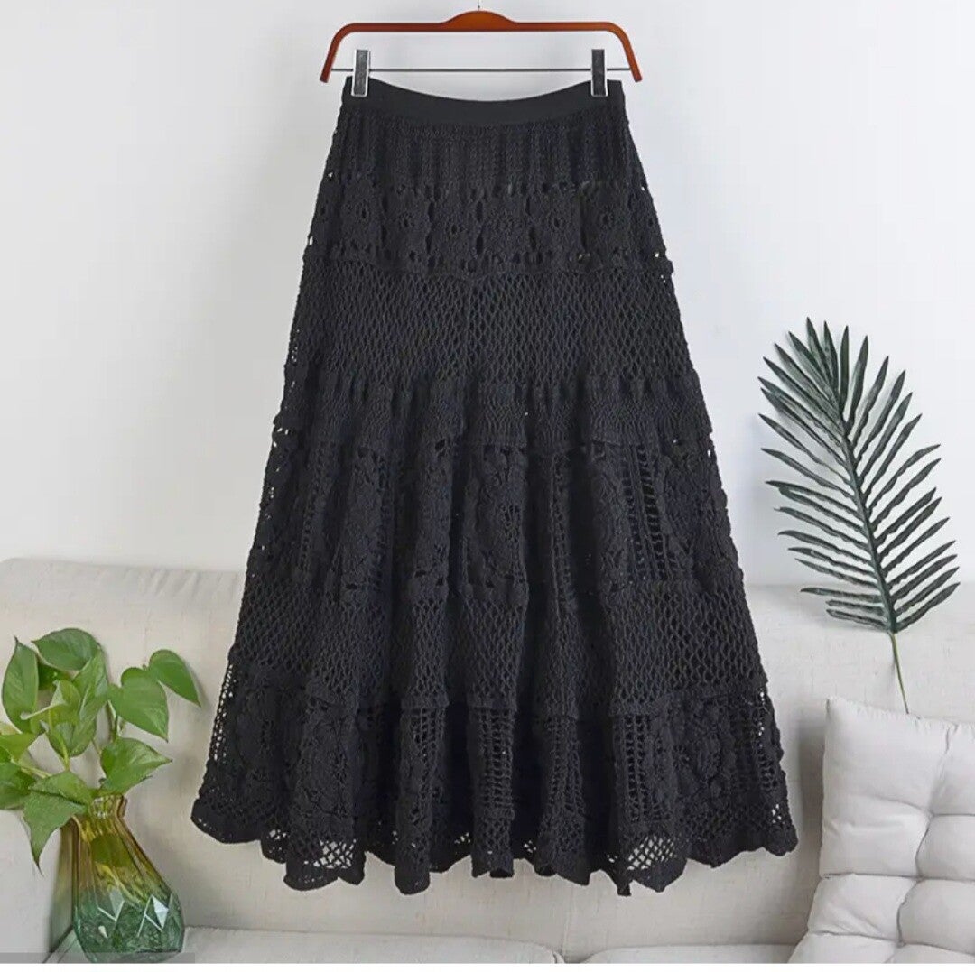 Embrace the timeless elegance of the Boho Bloom Crochet Skirt, a perfect blend of bohemian charm and sophisticated style. This long skirt features intricate crochet patterns that create a beautiful, airy texture, making it an ideal choice for warm weather and breezy days. The delicate floral motifs woven into the crochet design add a touch of romantic allure, capturing the essence of boho chic. Fit UK size 12-14